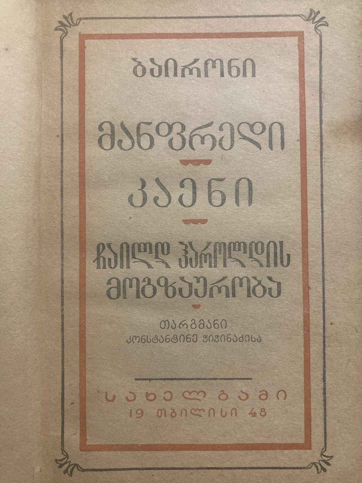 წიგნში მოცემულია ჯორჯ ბაირონის მთავარი პოემები: "მანფრედი", "კაენი" და "ჩაილდ ჰაროლდის მოგზაურობა". მთარგმნელი: კონსტანტინე ჭიჭინაძე