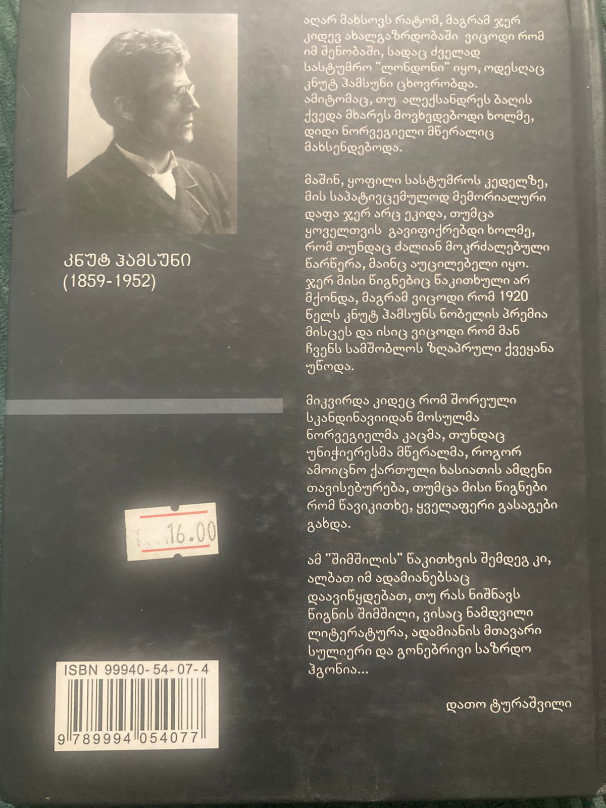 ჰამსუნის "შიმშილის" წაკითხვის შემდეგ კი, ალბათ იმ ადამიანებსაც დაავიწყდებათ, თუ რას ნიშნავს წიგნის შიმშილი, ვისაც ნამდვილი ლიტერატურა, ადამიანის მთავარი სულიერი და გონებრი საზრდო ჰგონია"... დათო ტურაშვილი